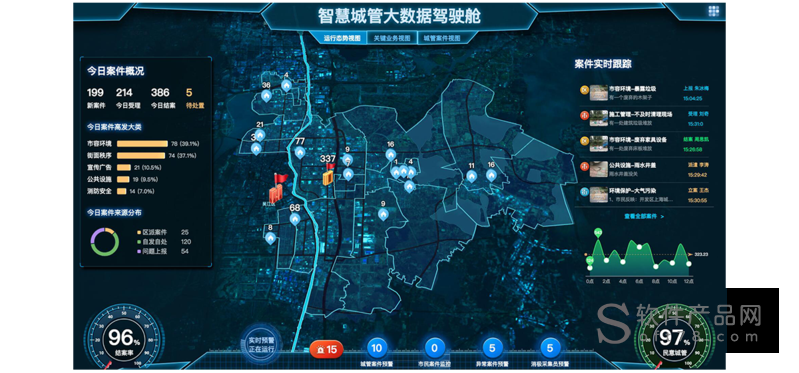 大屏幕监督指挥系统设在监督指挥中心,展现信息的实时监控,便于监督指挥中心和领导更加清楚地了解城市管理的状况。 可通过大屏幕直观地掌握各个区域的城市事件信息、业务办理信息、综合评价信息等全局情况,还可以对每个网格、城管监督信息员等个体的情况进行查询。 结合数字化城市管理系统的特点和要求,大屏幕监督指挥系统的显示区域可分为三个部分,具体包括地图显示区、案卷滚动信息区和详细信息显示区。 其中地图信息区主要显示全市整体地图具体包括行政区划图、街道划分图、网格划分图、城市管理事件分布图、城市管理人员位置分布图和当前办理的城市管理事件处理情况和评价信息。 案卷滚动信息区能够实时统计反映全市、区(县)所有网格在办案卷数;滚动显示正在办理的每个案卷基本信息;详细信息区是指到单个问题、网格的详细信息, 包括城管信息员位置、案卷办理情况、综合评价结果等。